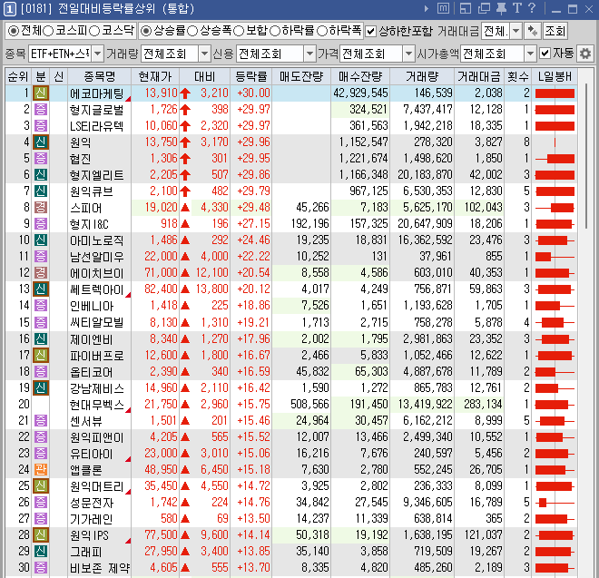거래대금 상위 30위 내 6% 이상